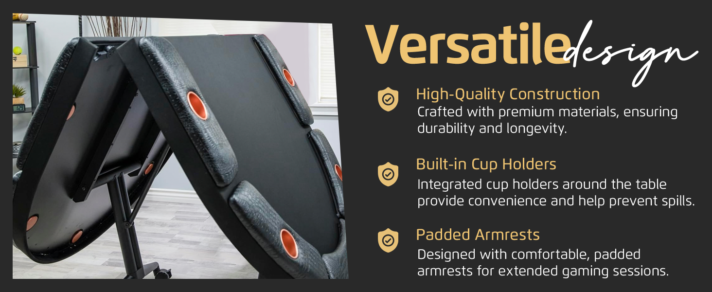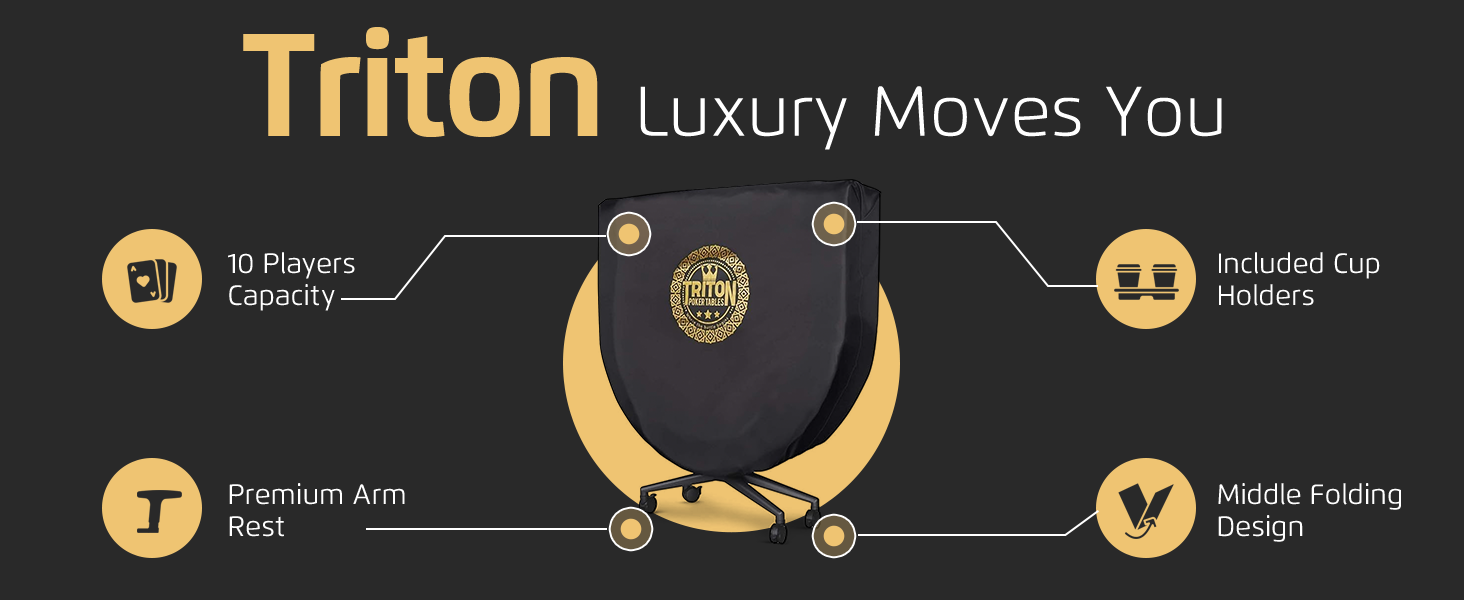 Each Triton table is crafted with a heavy-duty steel frame, padded faux-leather armrests, and stainless-steel cup holders. The felt surface delivers smooth card glide for professional play.