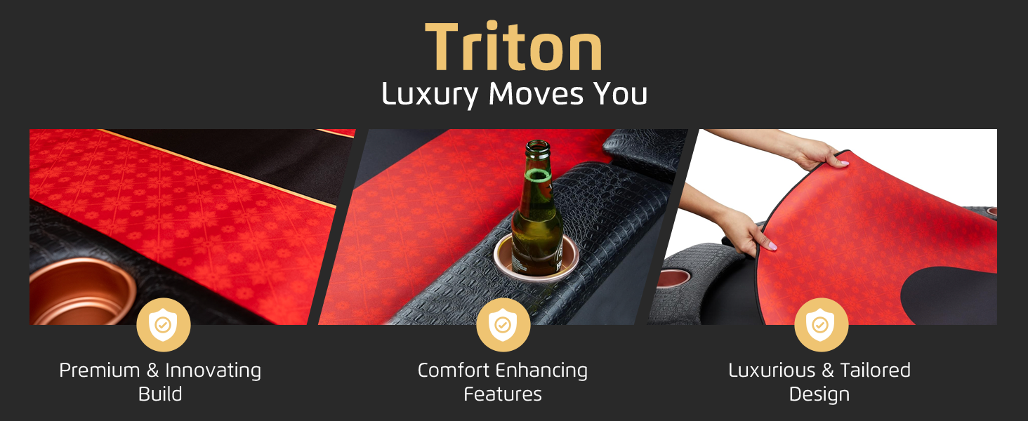 Each Triton table features a heavy-duty steel frame, padded faux-leather armrests, stainless-steel cup holders, and a premium felt surface for smooth card glide and consistent play.